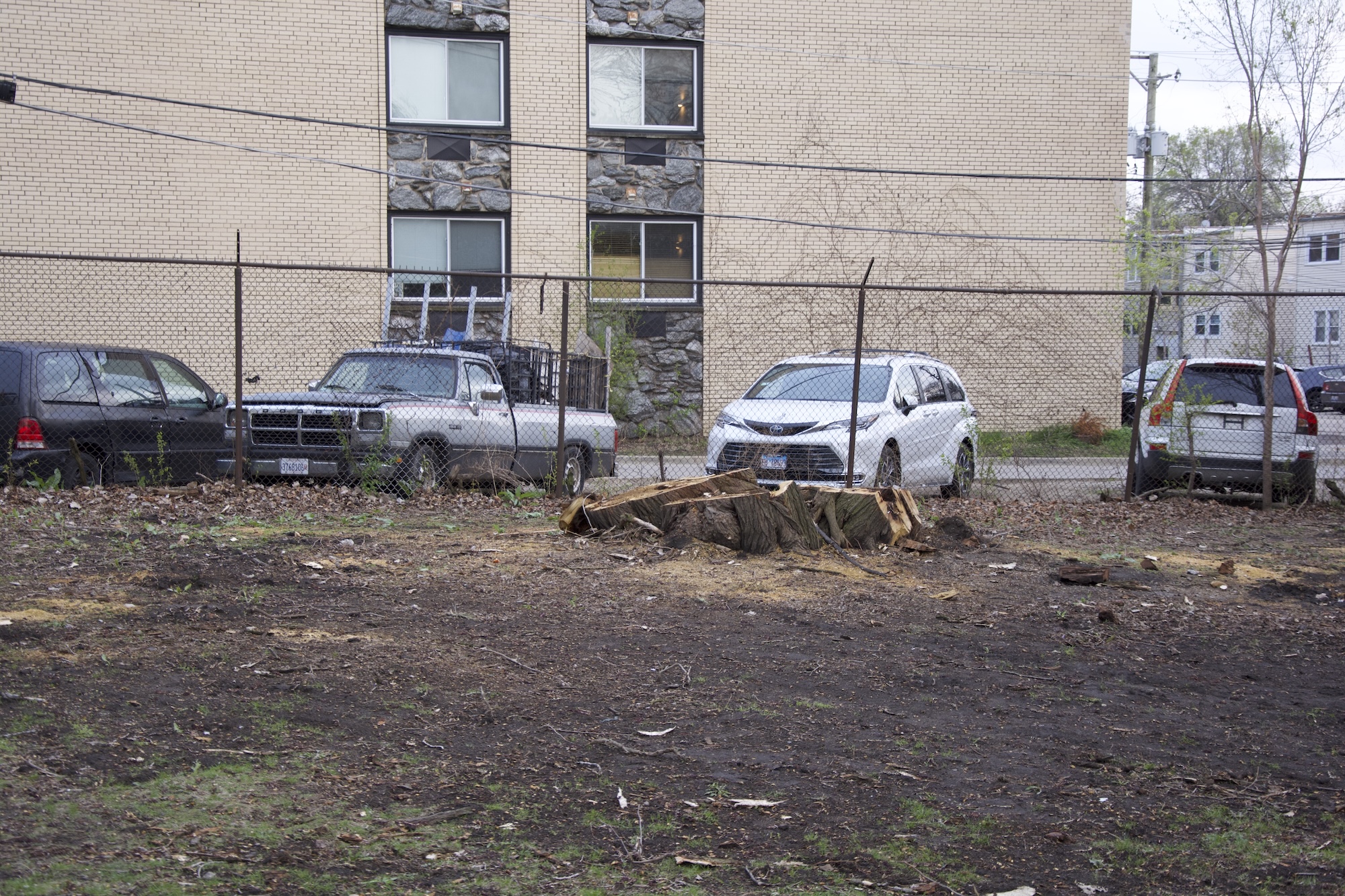 Turn around and walk across the street. Here is a gravel lot behind a chain link fence. You can see the debris of construction – loose piles and neat stacks of man-made rocks.