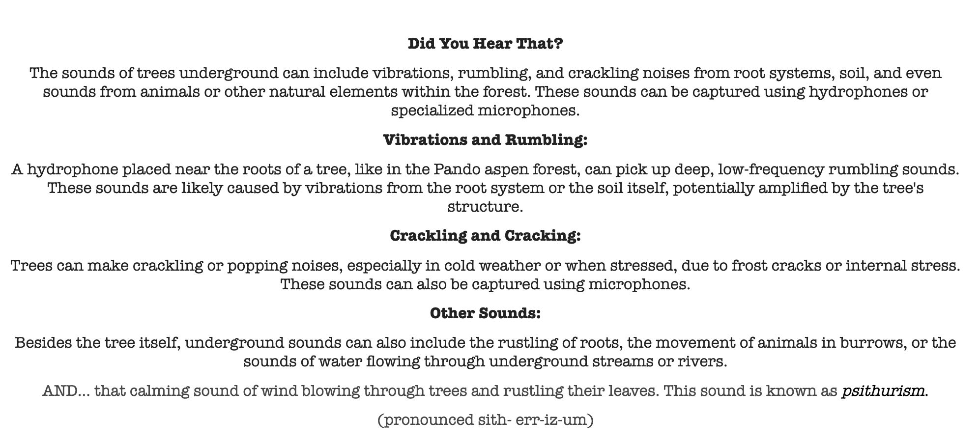 What is a Tree? launched on Arbor Day 2023, and was followed by guided walks on Arbor Day 2024, 2025, and upcoming 2026. We encourage you to experience this project on your own by finding a Mother Tree in the northeast corner of Warren Park, and proceeding along the walking path clockwise (to the left) at the first branch. What is a Tree? prompts you to observe, interact, personify, and engage with the arboreal inhabitants of the park. Below is a growing body of resources to help relate to and learn about trees.