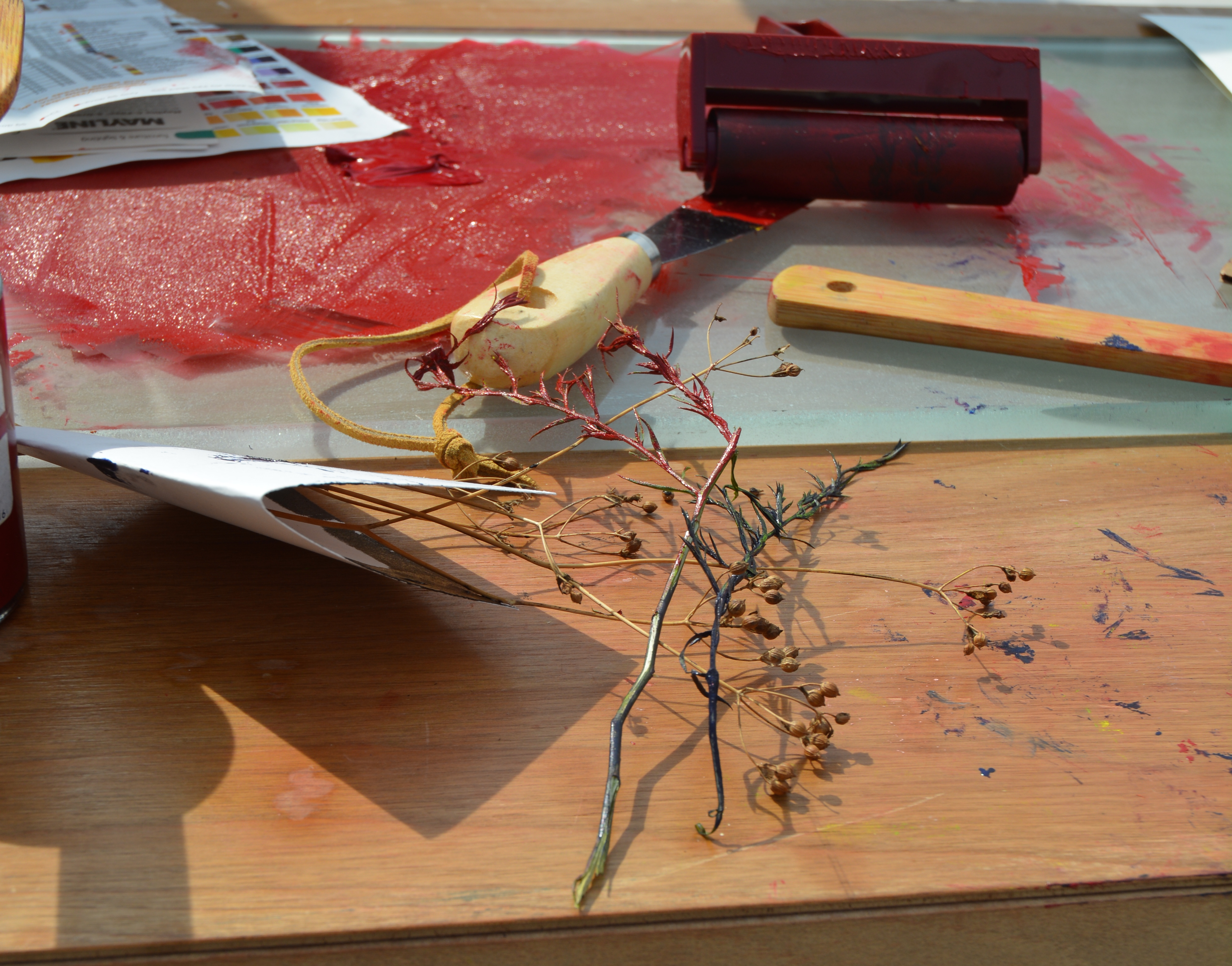 A community workshop led by Farrah Curescu utilizing organic materials from a community garden on W Howard St for printmaking.