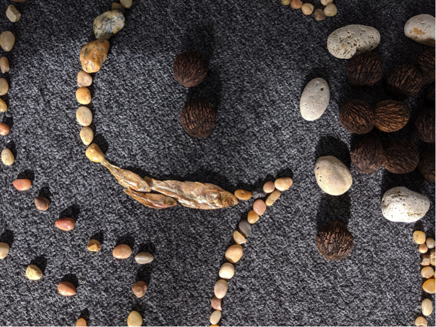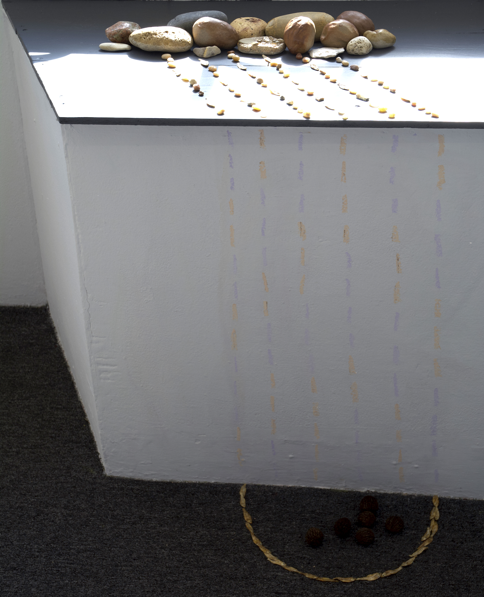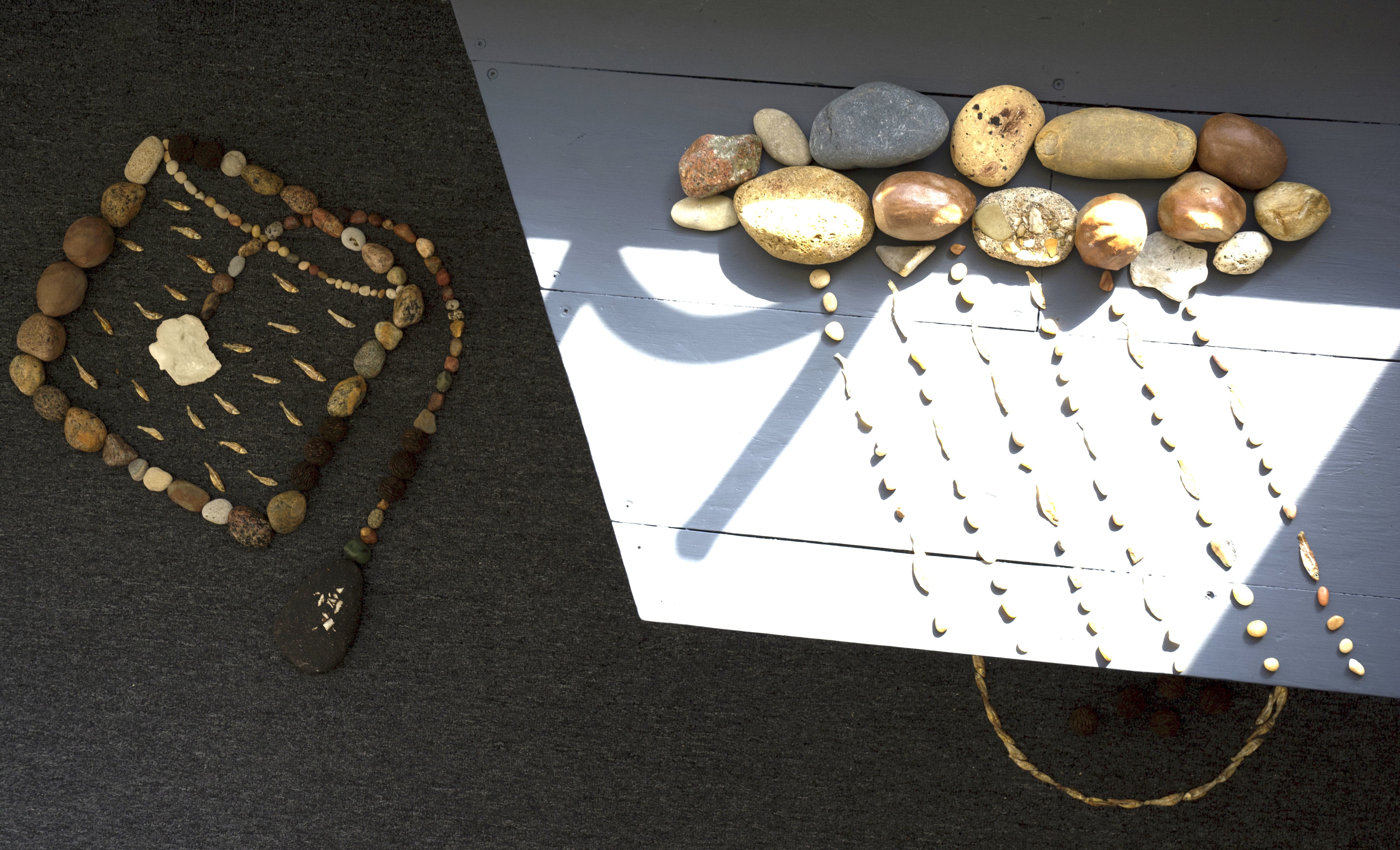 clay, black walnuts, charales, found assorted rocks, shellac, chalk, and materials from Lake Michigan including basalt, limestone, granite, mudstone, agate, vesicular basalt, jasper, gabbro, diorite, sandstone, slate, gneiss, concrete, clay brick, and iron slag